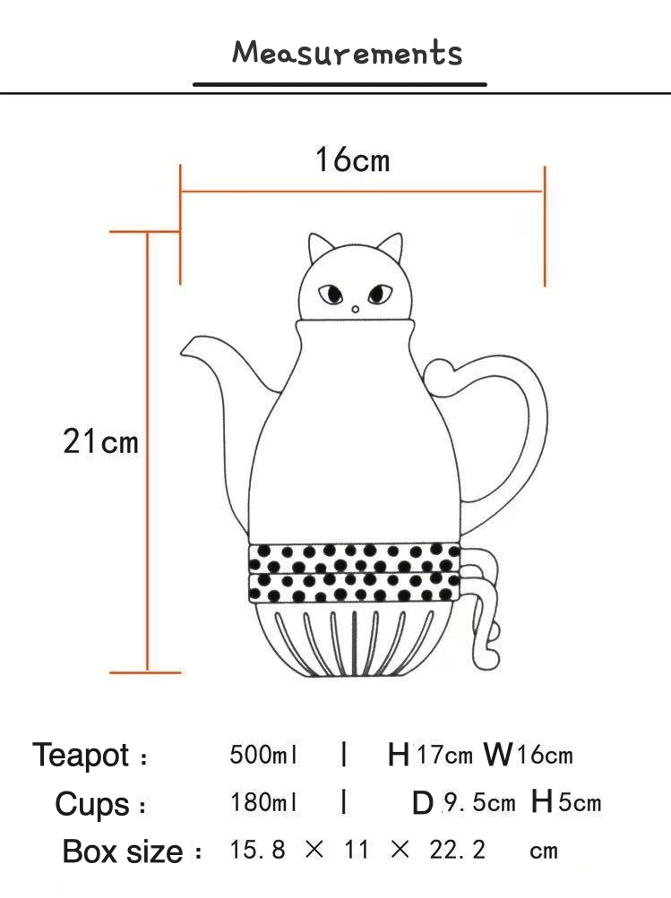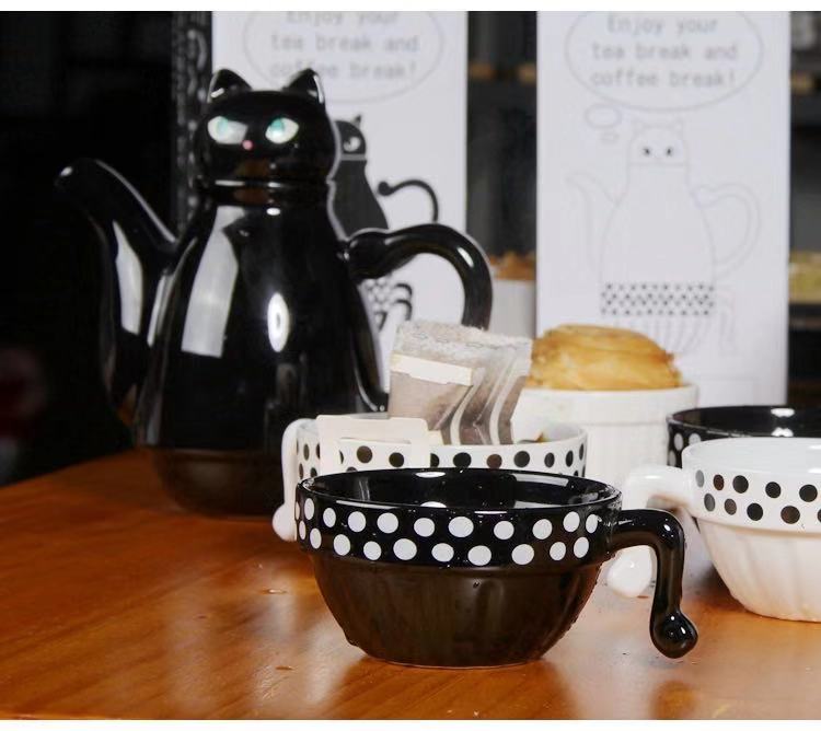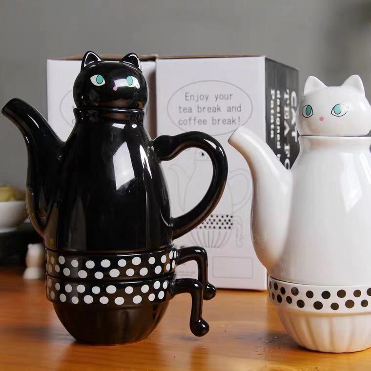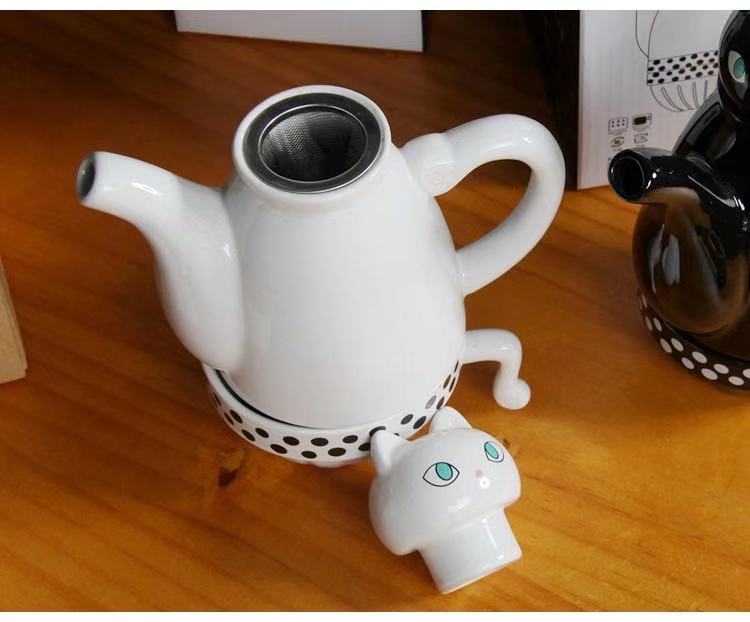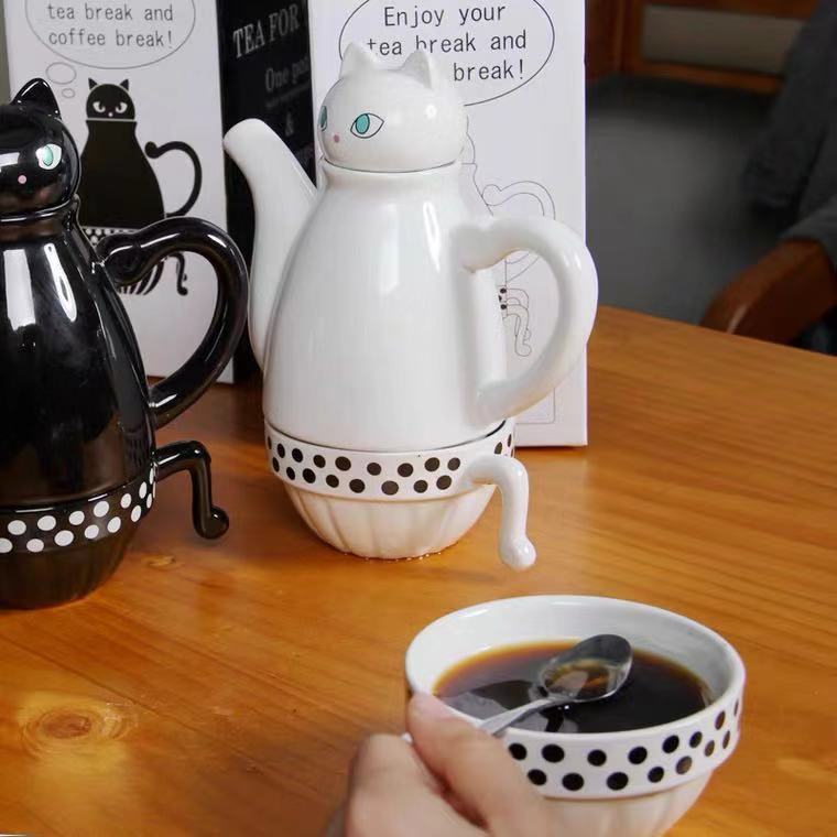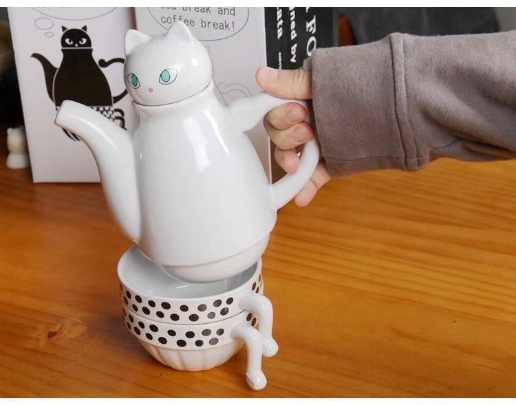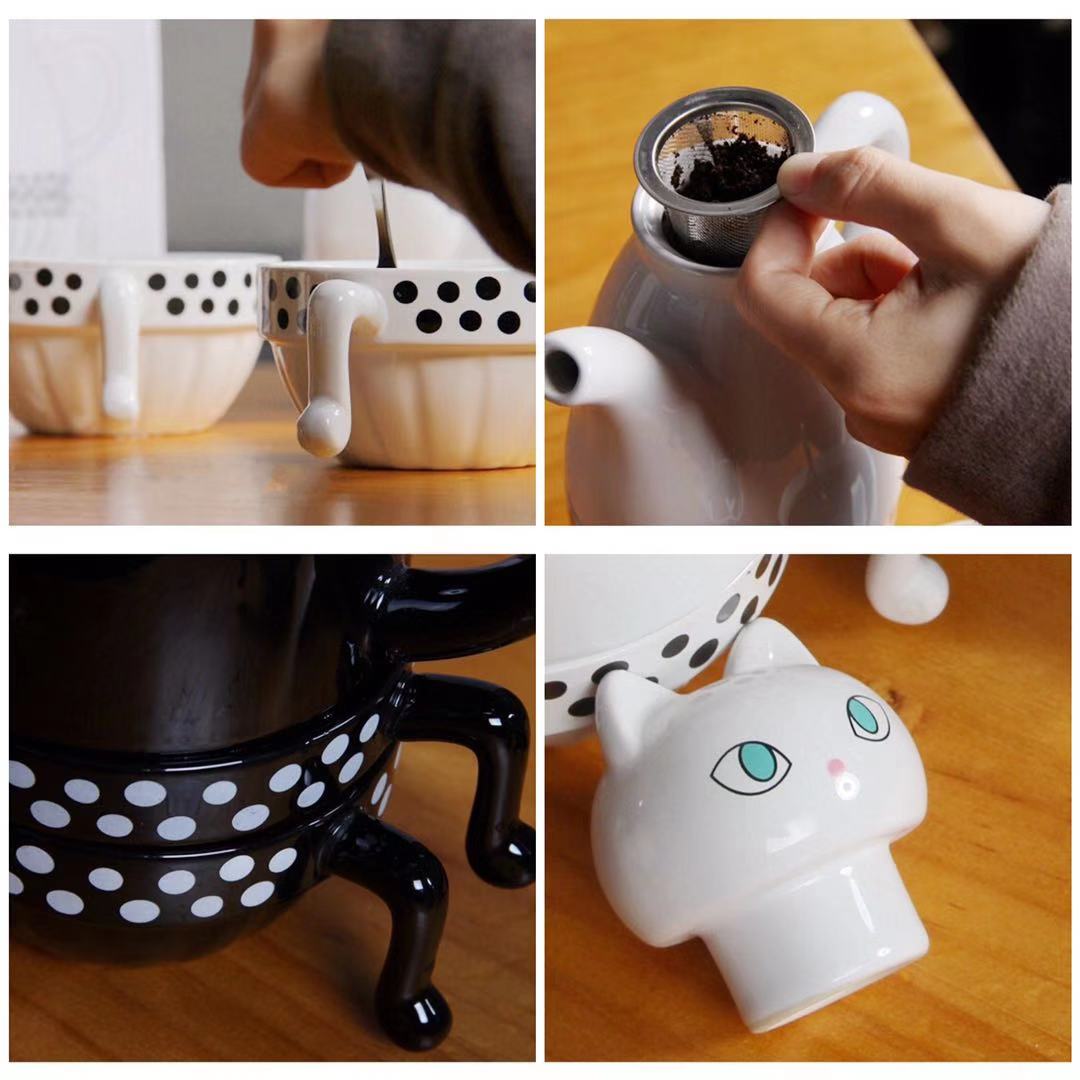 Creative Cute Ceramic Cat Shaped Teapot Set for Two with 2 Cups For Afternoon Tea Break