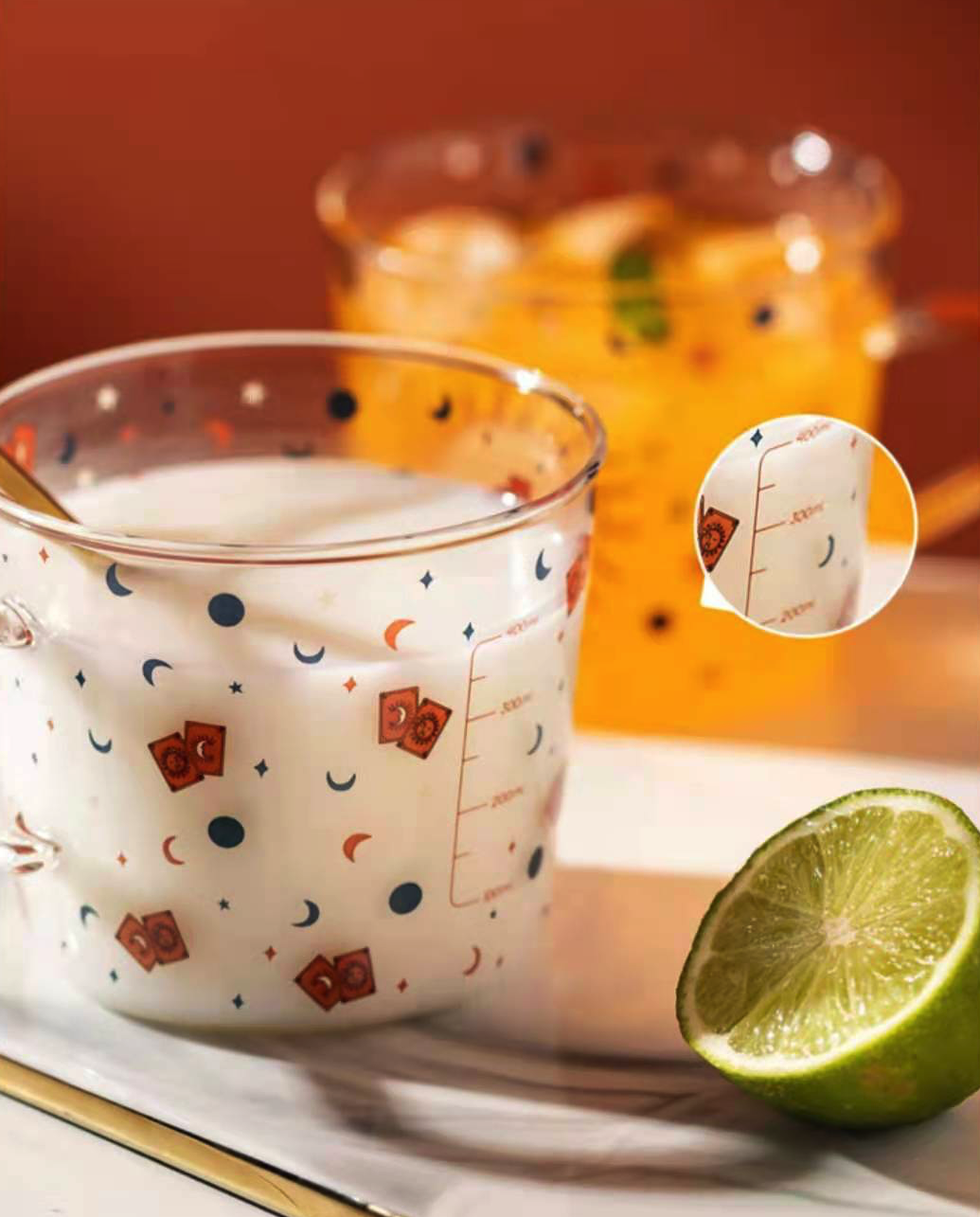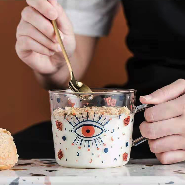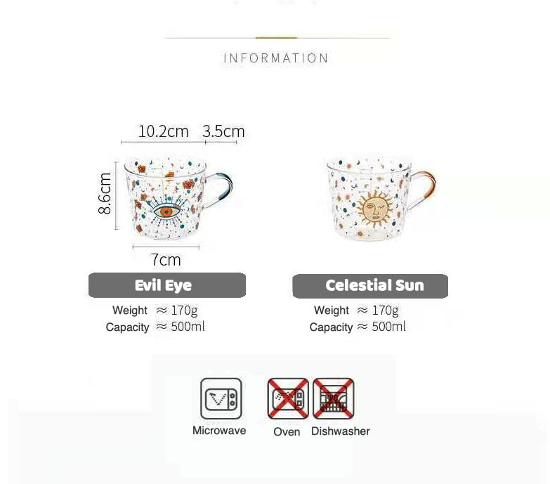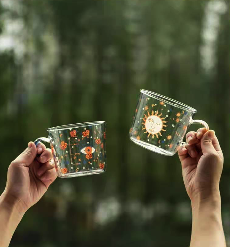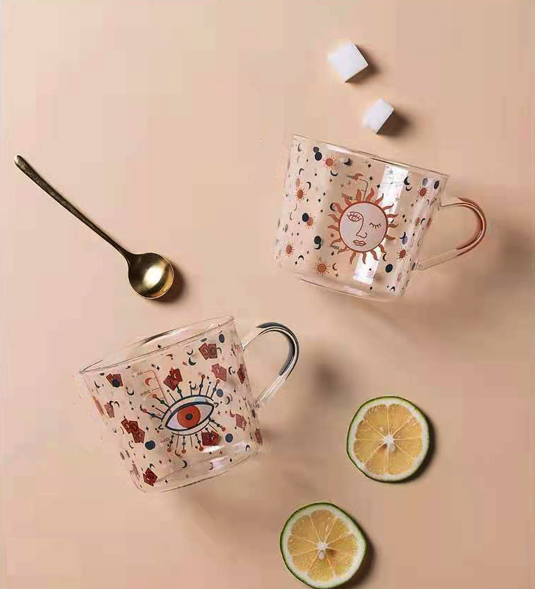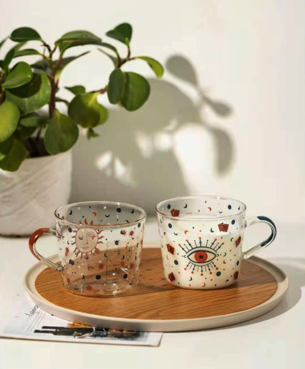 These clear borosilicate mugs with evil eye and celestial sun decor are ideal for hot and cold drinks. With their unique design these mugs are very aesthetically and social media worthy.