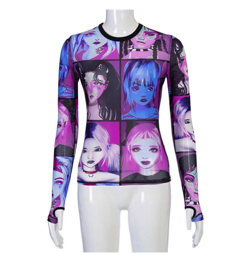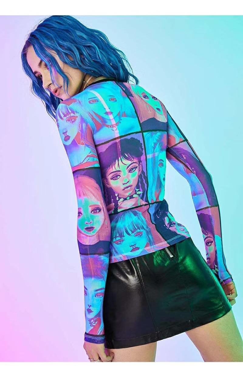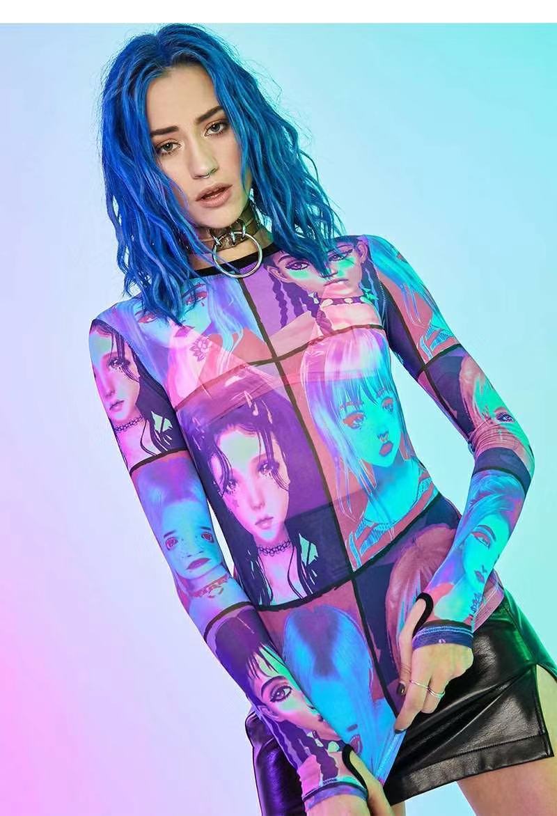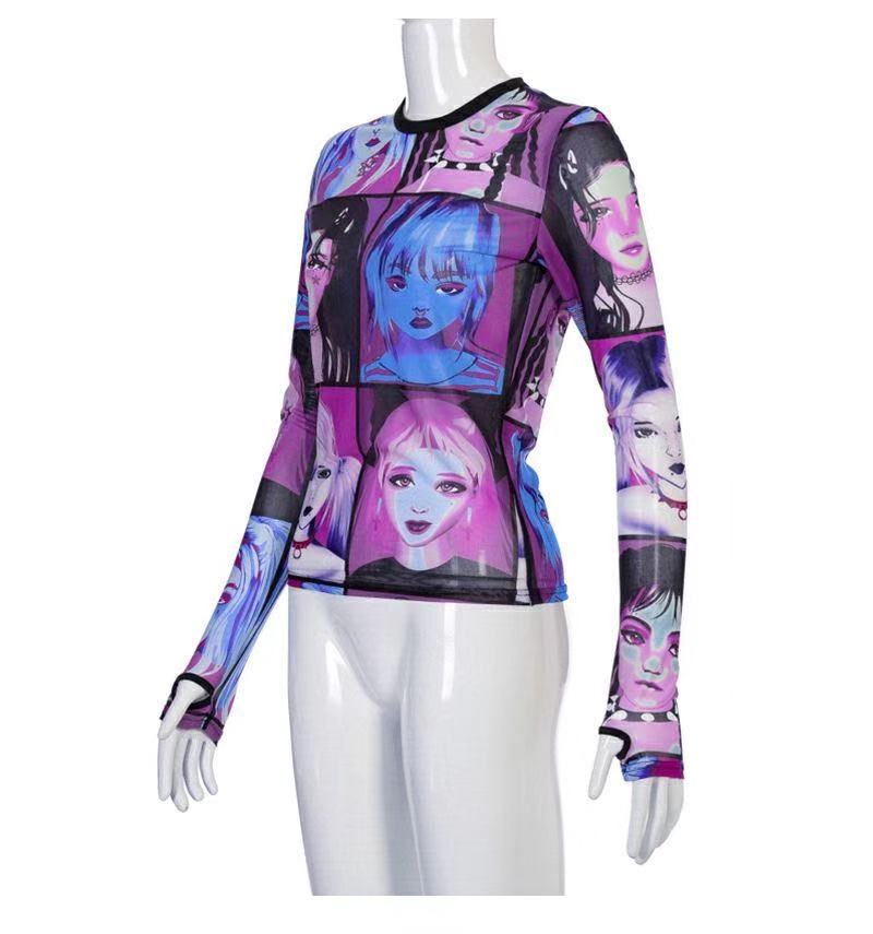 Indie E-girl Anime Girl Print Mesh See-Trough Long Sleeve Top Vaporwave Style