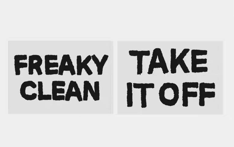 Featuring a bath-time white colourway and a graphic black quote which reads "take it off"' and "freaky clean"